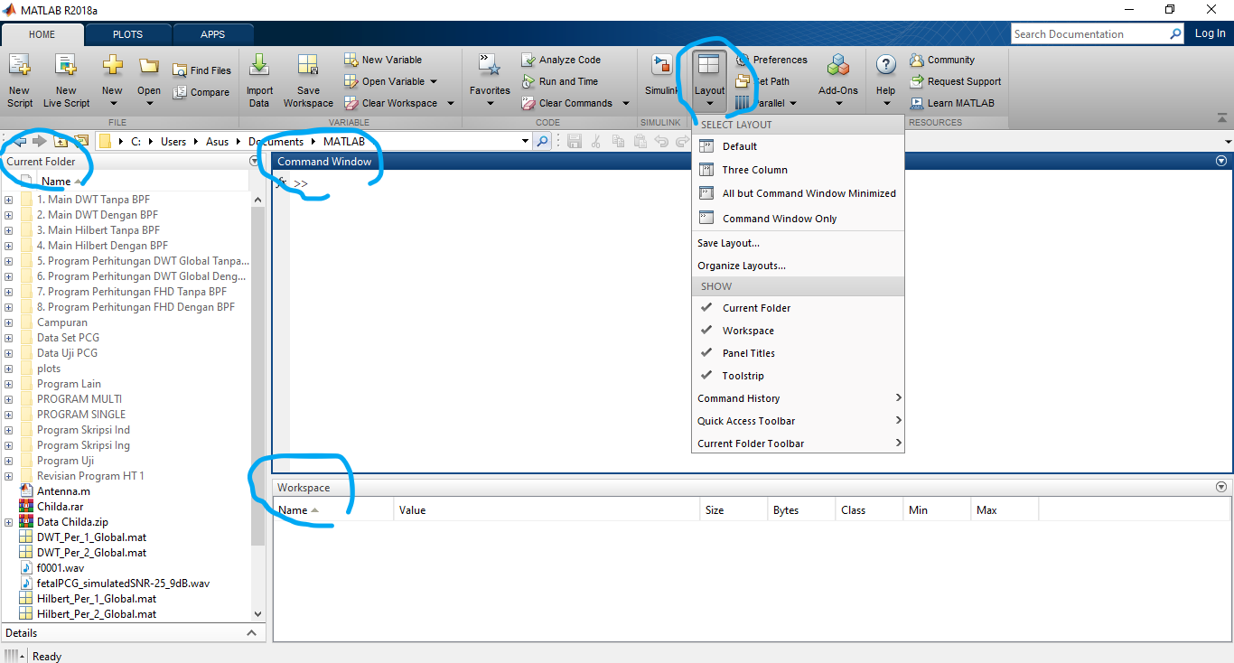 1. Current Folder, berfungsi untuk memberikan lokasi dari file yang telah kita buat sebelumnya pada Matlab.